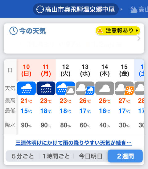 標高1100mの奥飛騨温泉郷中尾の最高気温は、