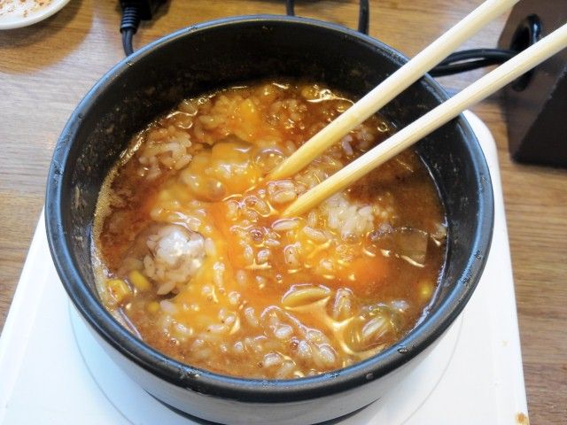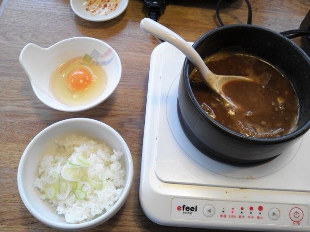 【麺を食い終えたら残ったスープにご飯と生卵とネギを入れて、〆にセルフでオジヤにして食う】